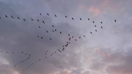 ふと見上げると渡り鳥が群れをなして、次から次へと西の空へ飛んで行きます。